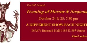 Join us for our 14th year of An Evening of Horror & Suspense in the Old-Time Radio Tradition University Church, at 57th & University, Friday & Saturday, October 27 & 28, at 7:30 PM ONE MORE NIGHT! Directed by Sasha Austin Spooky episodes, old and new, haunting melodies, your elegantly ghoulish announcer and those commercials. We’re […]