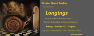 October Staged Reading Selections from Longings A book of poems & short prose pieces Written & directed by Rosina Neginsky Friday, October 10, 7:30 pm Augustana Lutheran Church, 5500 S. Woodlawn Avenue Please join us as we present selections from Rosina Neginsky’s 2022 collection, Longings. Longings is a collection of the songs of a soul singing, […]