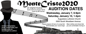Join us for MonteCristo2020 auditions on January 7, 2026 from 6-9pm and January 10, 2026 from 1-4pm. Auditions are held at Augustana Lutheran Church (5500 South Woodlawn Avenue). Please prepare 32 bars of a song that demonstrates your vocal range and bring your own backing track. Also please wear clothes and shoes that you are […]