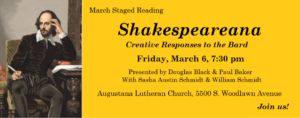 Join us for our March Staged Reading Shakespeareana: Creative Responses to the Bard Friday, March 6, 7:30 pm Augustana Lutheran Church. 5500 S. Woodlawn Avenue What did Shakespeare have to tell us about war and conflict? What about love and poetry? What would Yorick say if he had a chance to give his side of […]